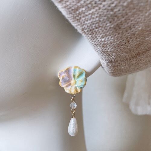 シュガークッキーの様なマカロン色のビオラ♡♡雫型のパールが揺れる可愛いピアスです。
