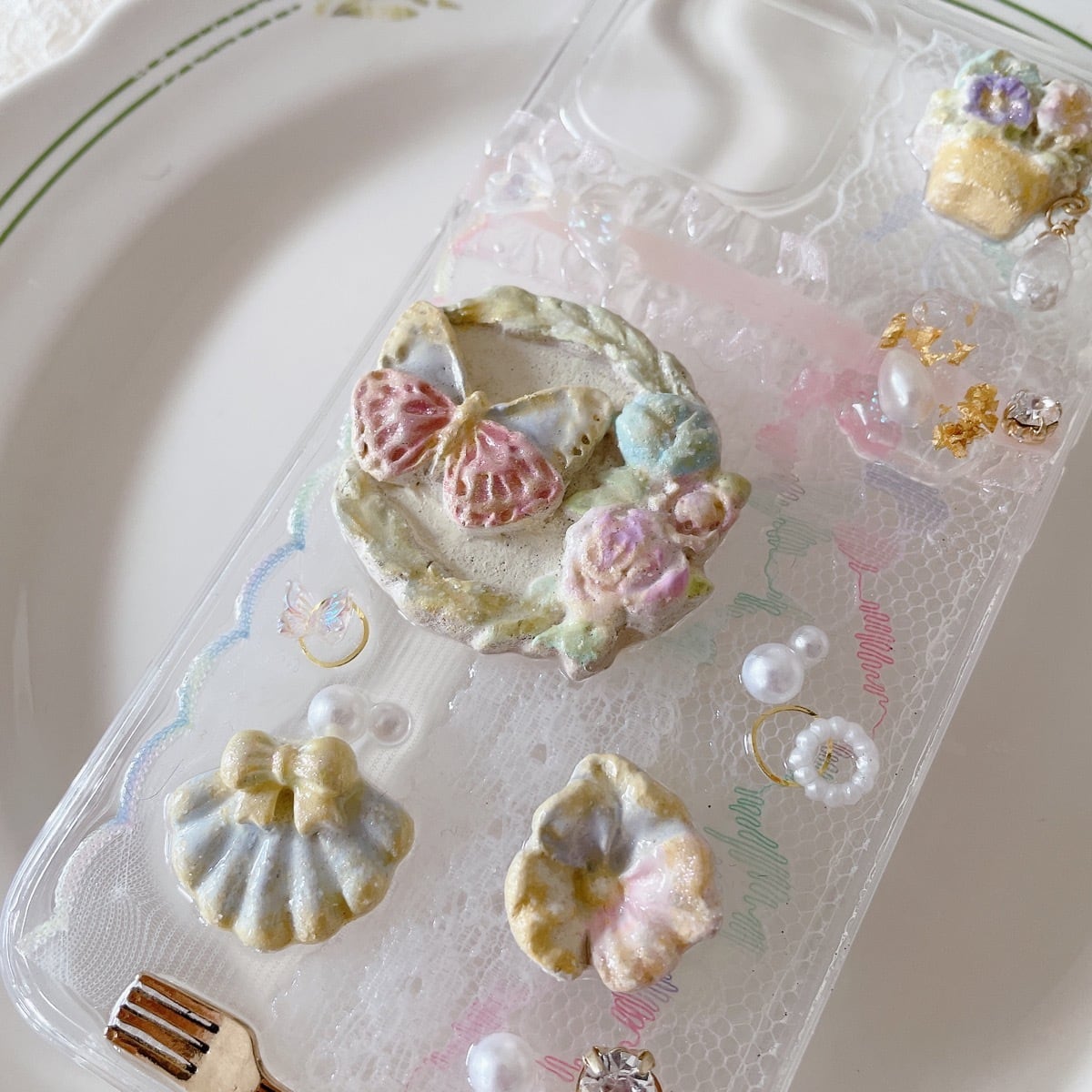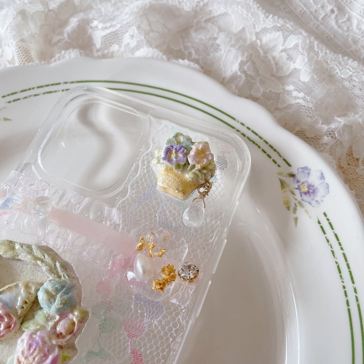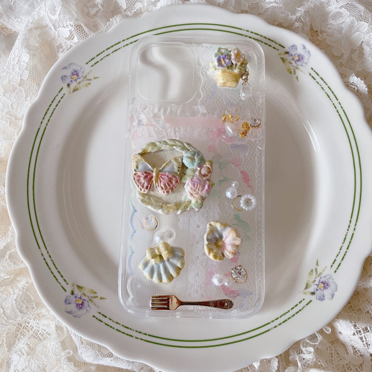 可愛いレースをかざり、森の雰囲気をイメージしました♡パーツは陶土で作ってます。フェイクの粉砂糖をのせて、マカロン色のクッキーに見立てました♡お花の雫みたいに水晶を加えて華やかな雰囲気になりました♡お出かけやパーティー時などに活躍してはいかがでしょうか?