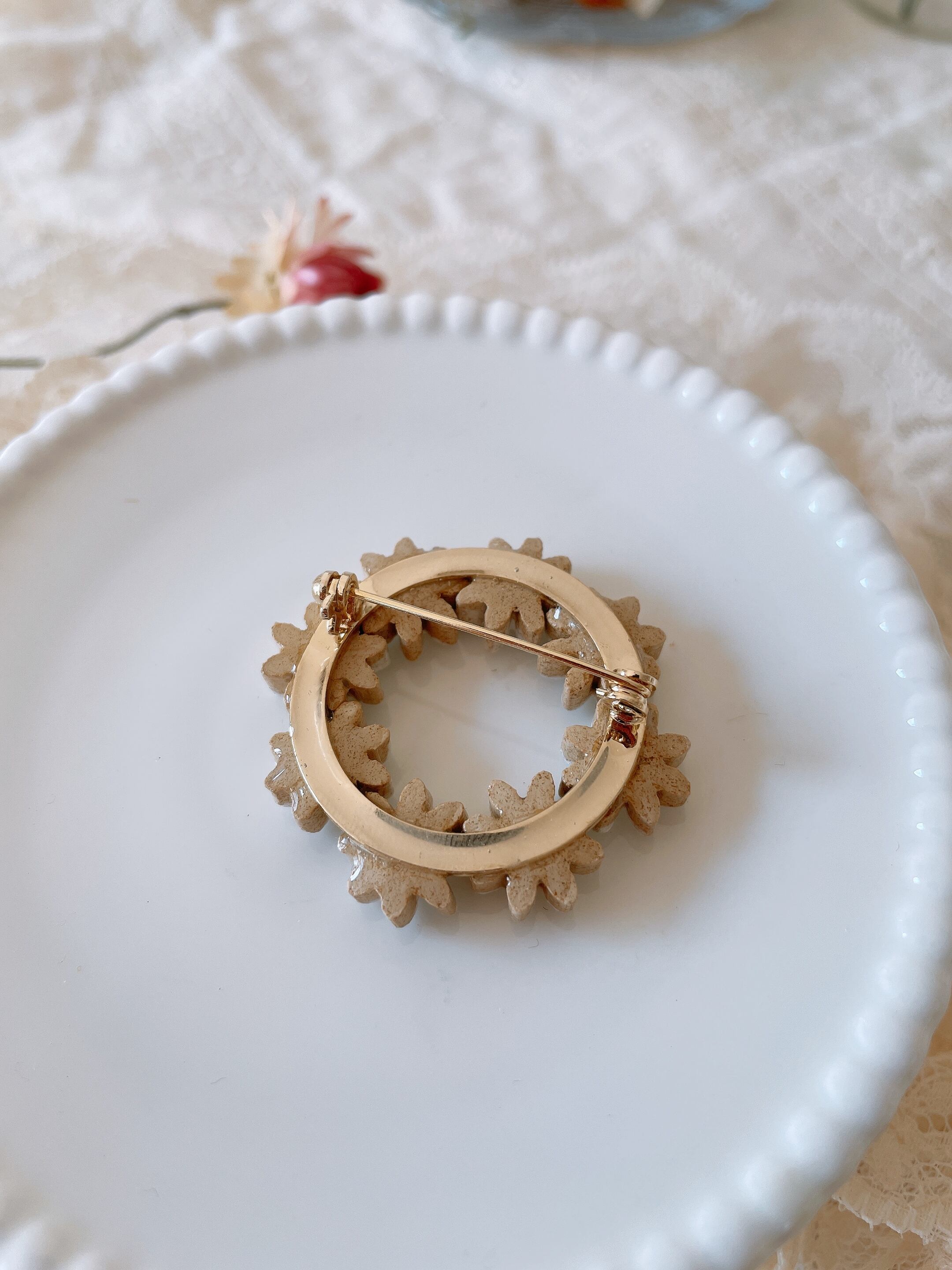 お花のマーガレットがリースになった可愛いブローチです♡