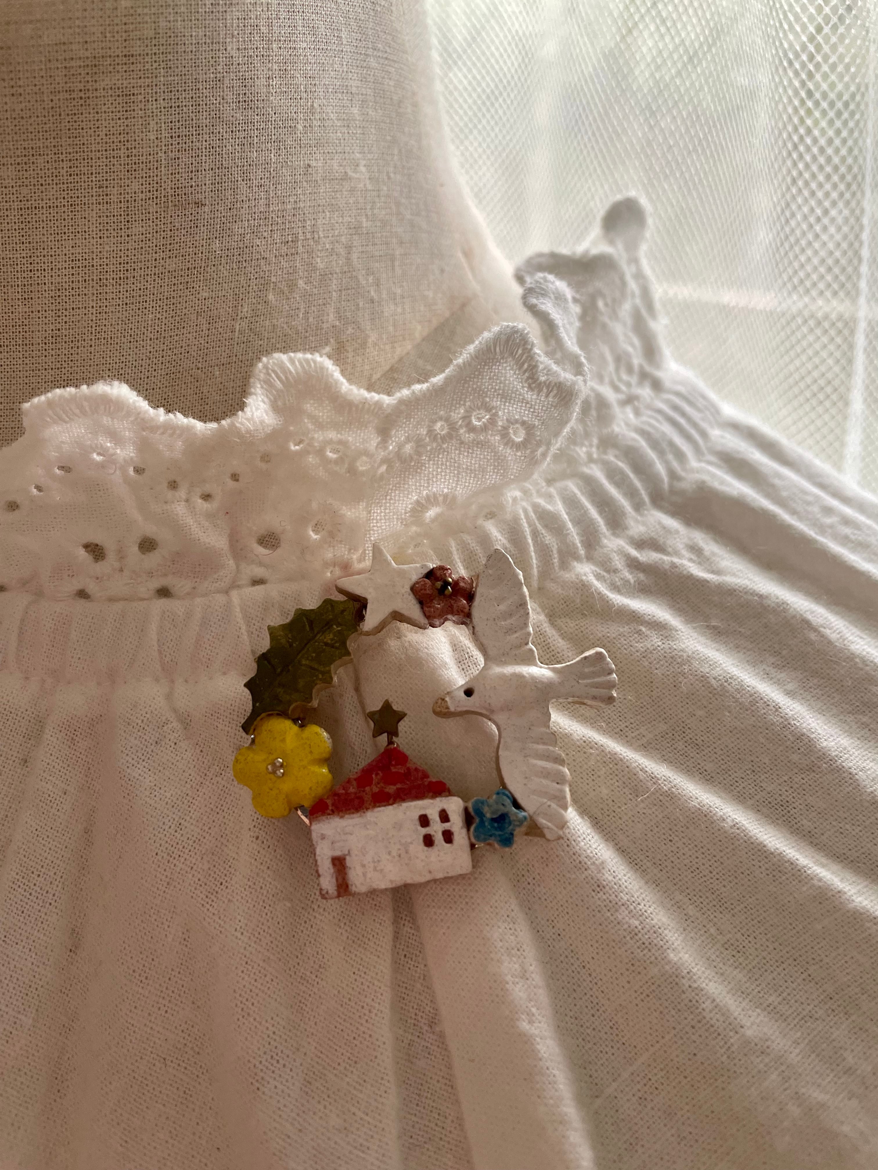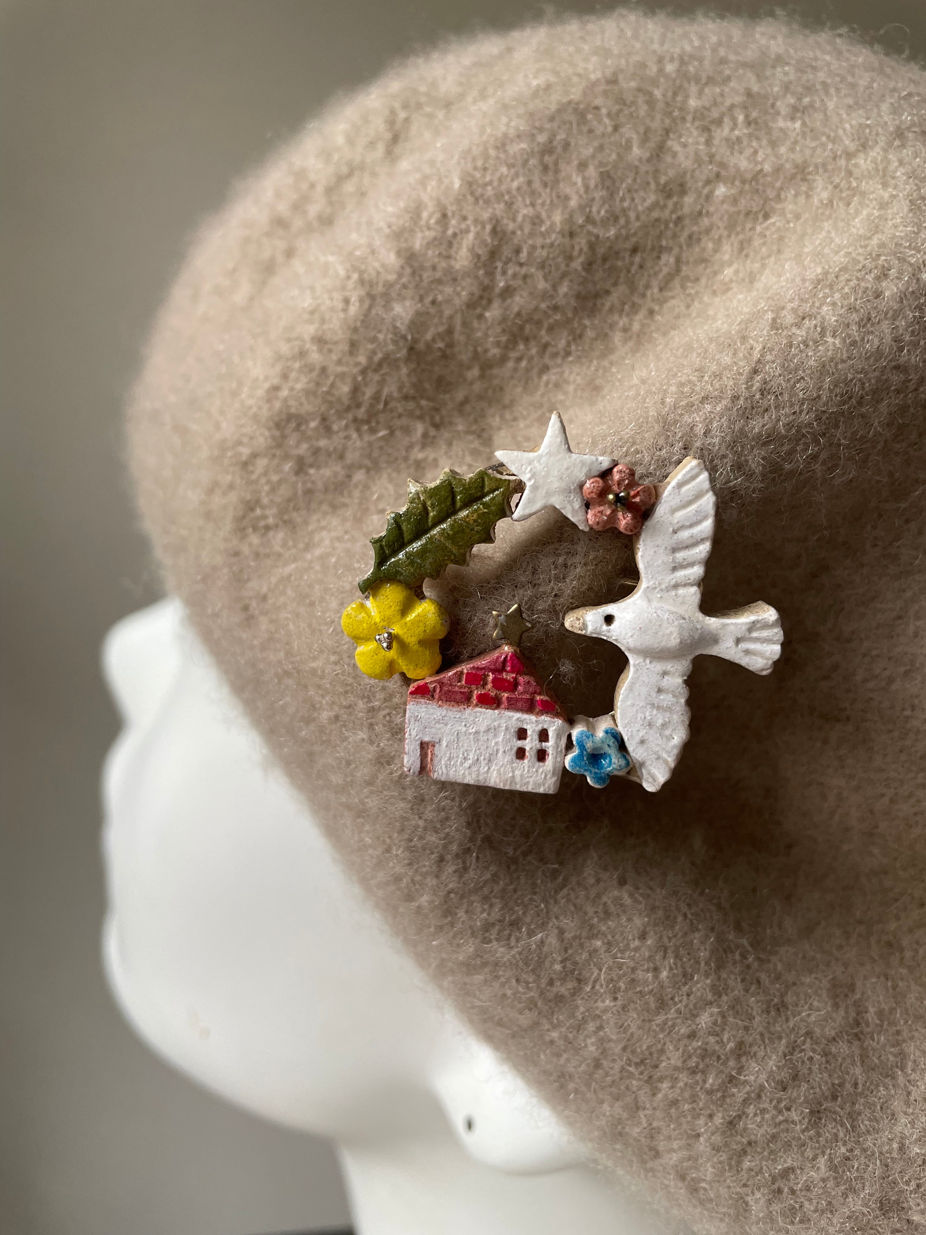 小鳥やお家、葉っぱ、花などを組み合わせたリースブローチです