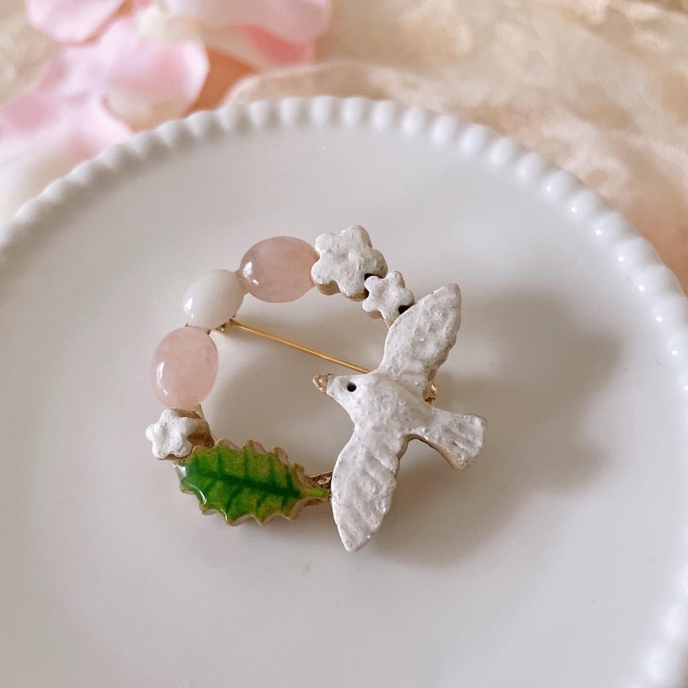 オーブン陶土で作った「小鳥と天然石のブローチ(ローズクオーツ)」です♡