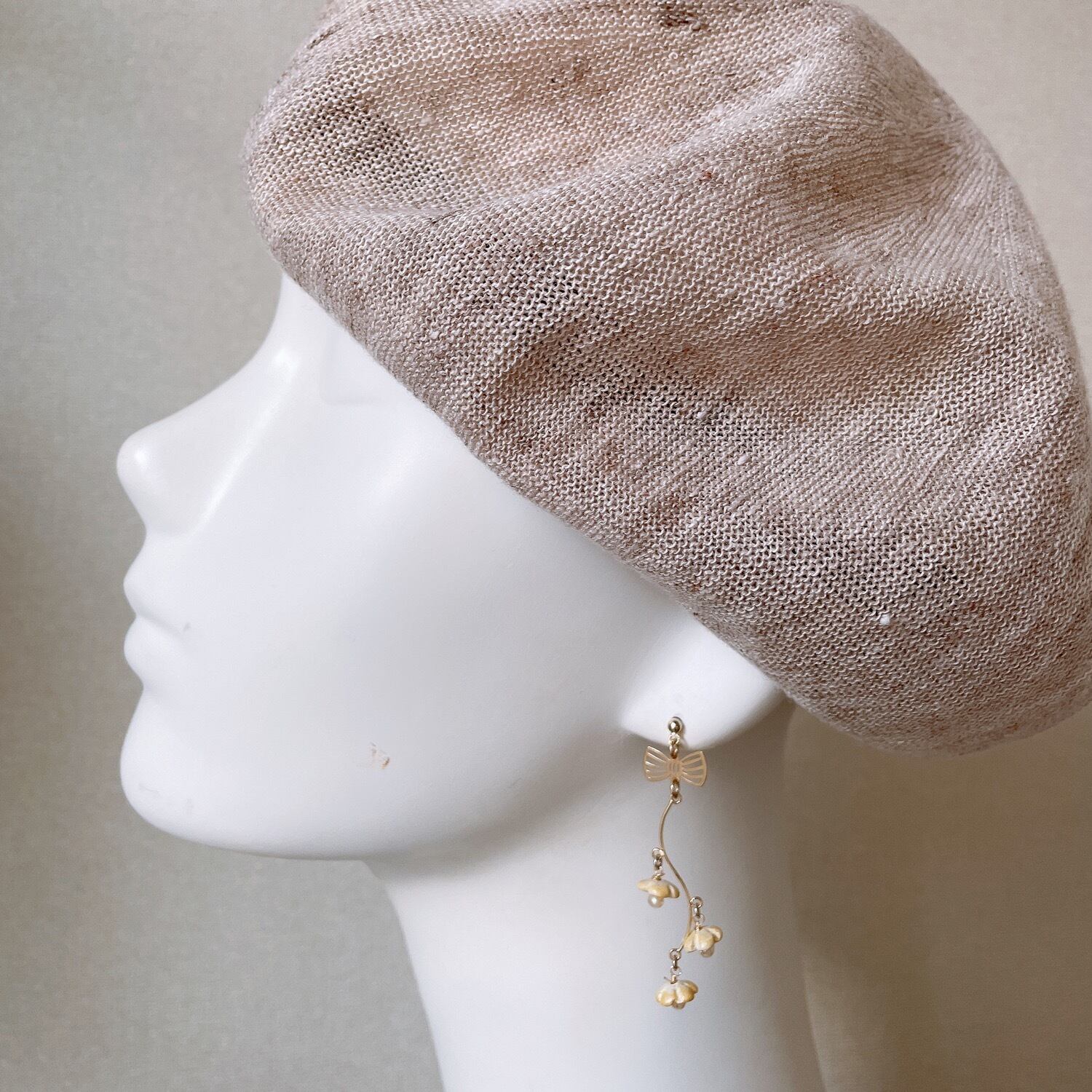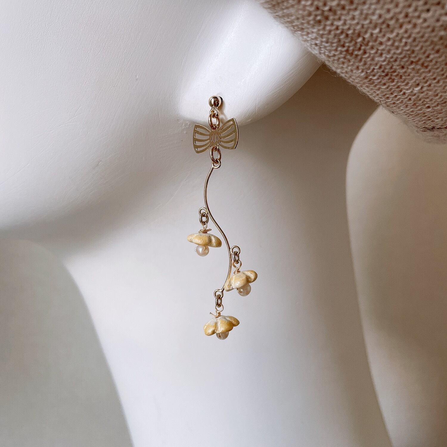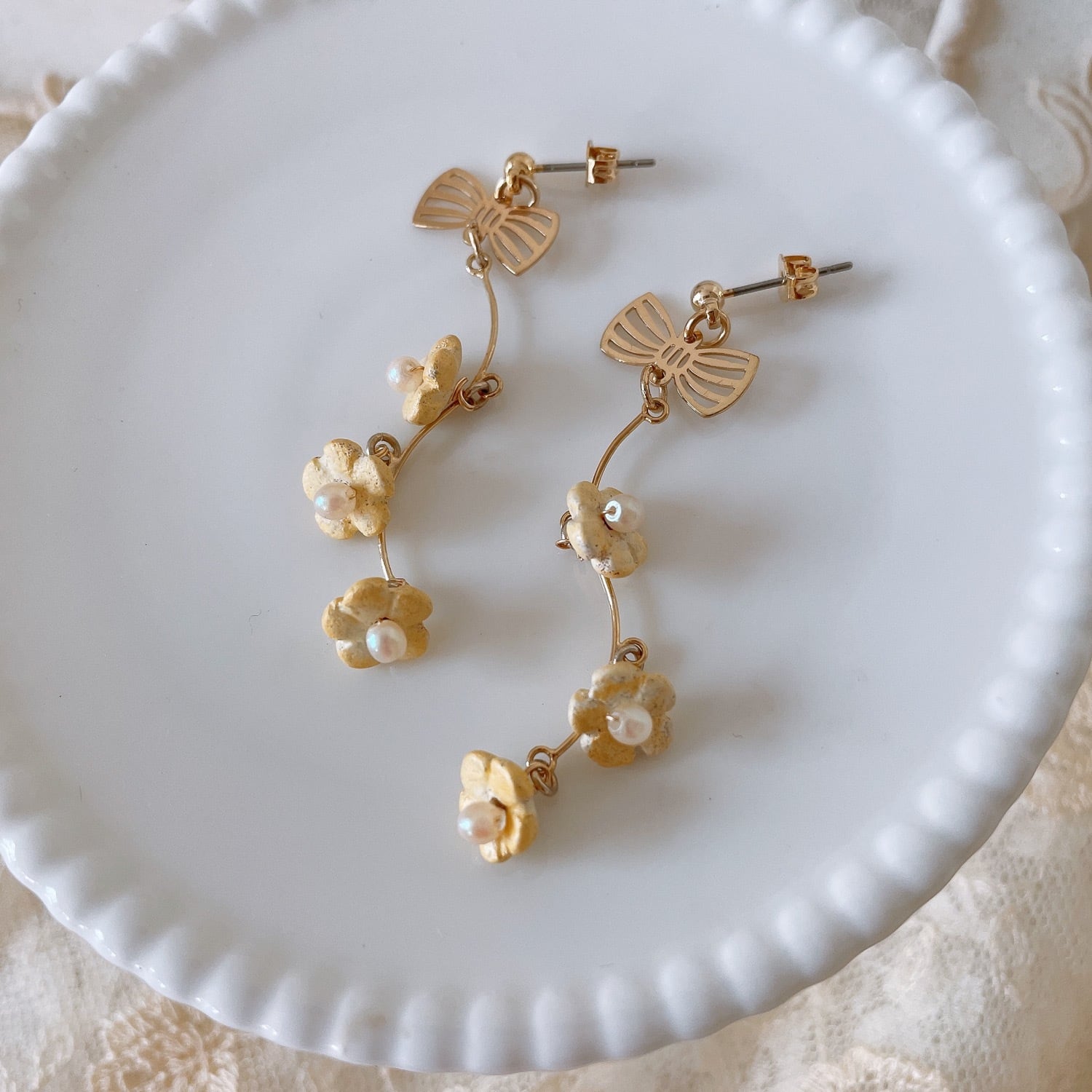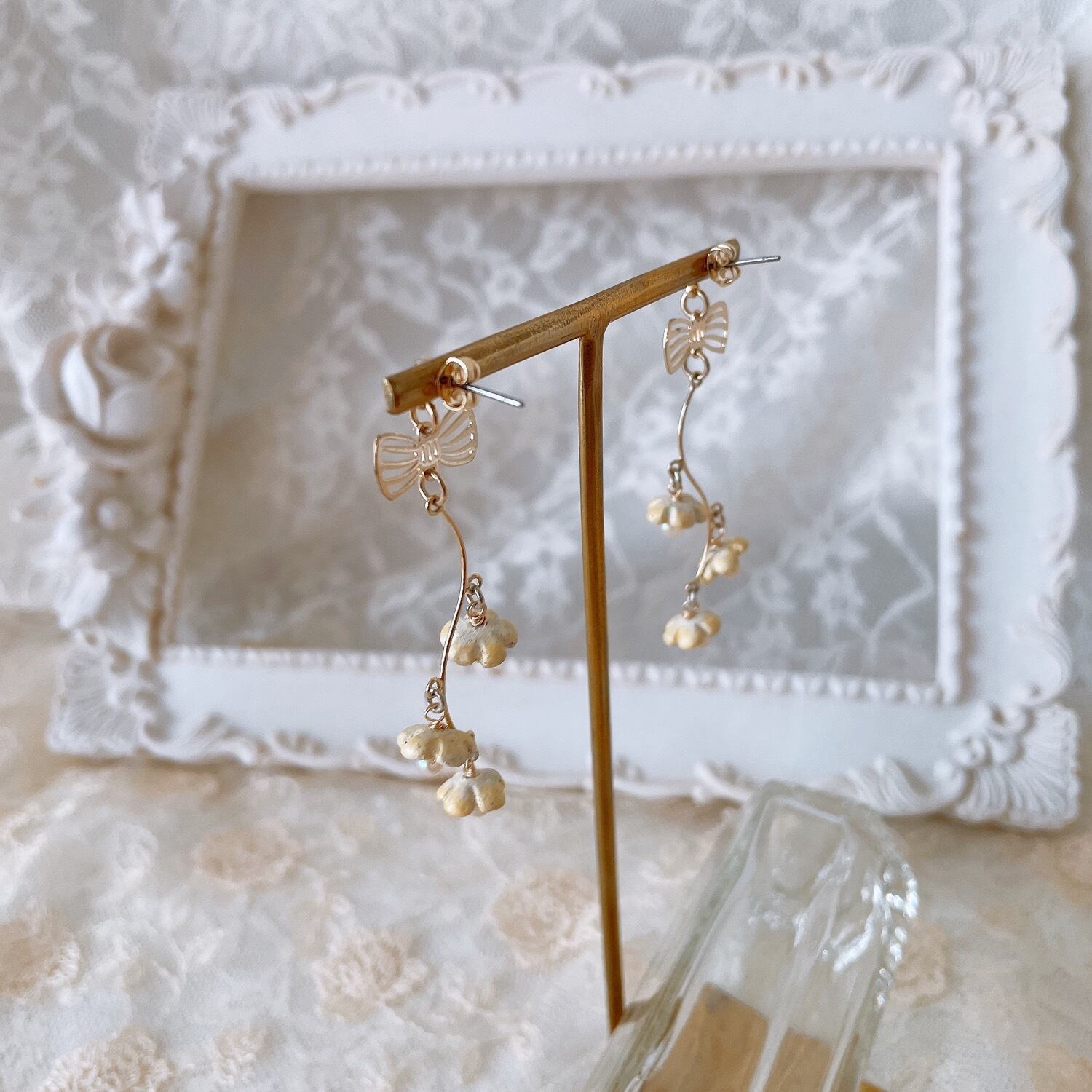オーブン陶土で作った「リボンと小さなお花のロングイヤリング(ピアス)」です♡